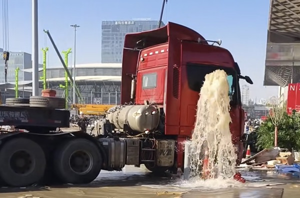 据目击者回忆,事故发生在新国际博览中心N2馆附近的室外区域。当时,有参展商正在做撤展收尾工作。突然,一辆半挂车驶入该区域。驾驶员在驾车时,疑因消防栓位于其视线盲区内,导致车辆的车头右侧部位猛烈撞上消火栓。消火栓被当场撞断,瞬时喷出的水柱高2米左右。