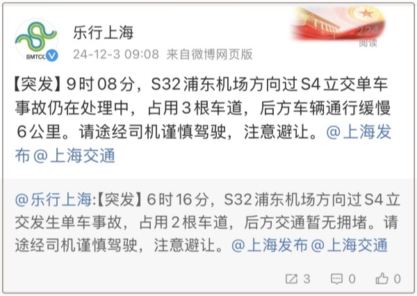 据上海市交通委交通指挥中心官方微博发布的消息:9时08分,S32浦东机场方向过S4立交单车事故仍在处理中,占用3根车道,后方车辆通行缓慢6公里。请途经司机谨慎驾驶,注意避让。