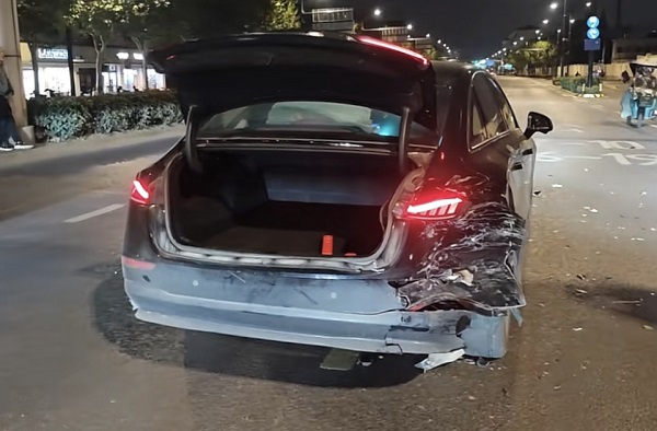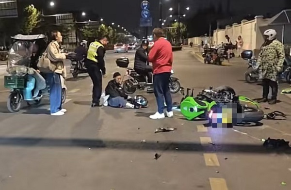据了解,当时一辆摩托车沿石龙路行驶至东泉路路口时,与前方一辆黑色轿车发生碰撞。由于撞击力度较大,造成轿车车尾左后侧凹陷,摩托车骑手连人带车倒地,并向右侧滑向路边,摩托车受损严重,地面上散落着碎片,摩托车防冻液洒漏在路面上。