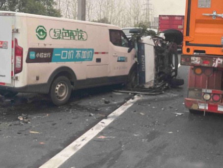 据目击者说,这起事故涉及两辆货车和一辆面包车。据途经现场的一位市民介绍,事故发生后,三辆车都停在一号车道上,其中,一辆货车逆向侧翻在车道上,后方一辆面包车撞上侧翻车辆车头,现场满地碎片,高速公路中央护栏一处被撞凹陷。