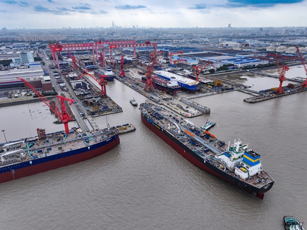 图说:外高桥造船有限公司的码头船坞呈热火朝天/陆佳骏 摄