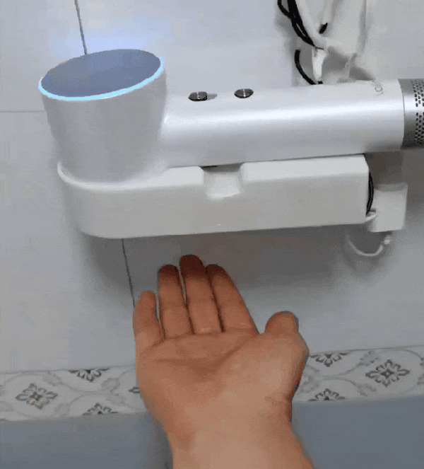 拿起来是吹风机,平时挂着就是干手机,手放在下面,自动出风吹干。