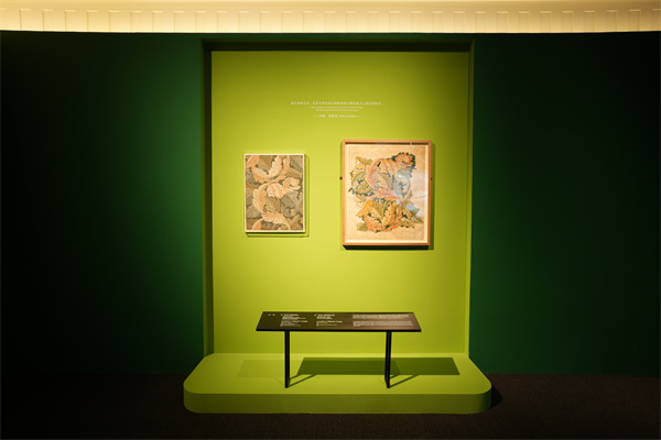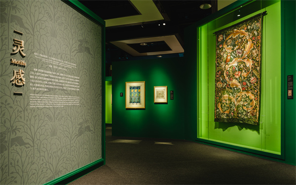 展厅共分为四个空间,每个空间都运用不同色彩展现整个展览简洁自然而又富有层次感的布局。序厅“缘起”被橄榄绿和牛油果绿晕染,概述英国工艺美术运动的起源与代表人物,其中展示的威廉·莫里斯“茛苕”壁纸设计图手稿不可多见,设计手稿和绿色的撞色带来治愈感。第二空间“灵感”篇章围绕乡村、信仰以及来自中国等东方的灵感,这三个核心主题向人们展示工艺美术运动的创作起点。第三空间“制造”篇章展现了要让设计师们成为材料与成品之间媒介的理念主张。威廉·莫里斯的伟大成就,还在于成全了教育与女性,让劳动女性在工艺美术之家依靠手工编织独立谋生。
