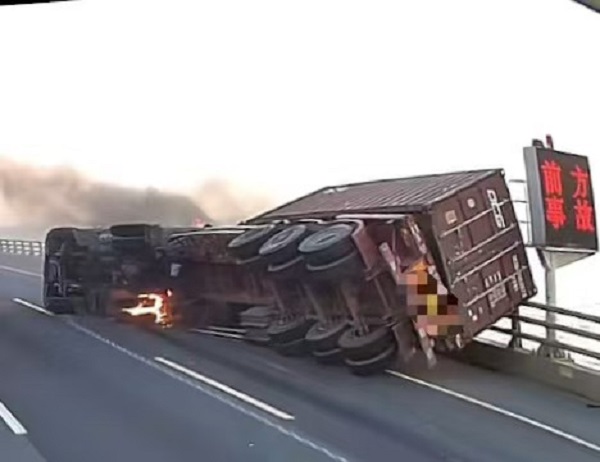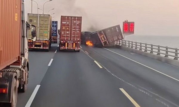 据途经现场的驾驶员介绍,当时看到一辆集卡侧翻在东海大桥往洋山港方向的三号车道上。车辆侧翻后,车头后轮处有明火燃起,集卡箱体斜靠在大桥护栏上,地面上留有一段拖痕。事故发生后,侧翻车辆驾驶员立即撤出并拨打报警电话。