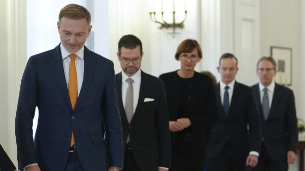 当地时间11月7日,自民党主席、前德国财政部长林德纳(左一)带领本党成员退出联合政府。图说:GJ