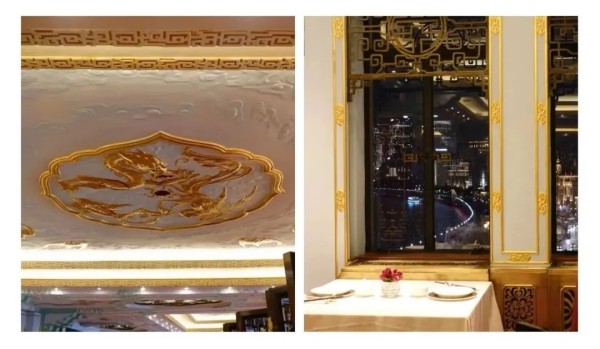 穿过大堂走廊,可以看到一个古铜色的金属雕花玻璃门框,复古气息浓郁,与饭店的气场十分合拍。