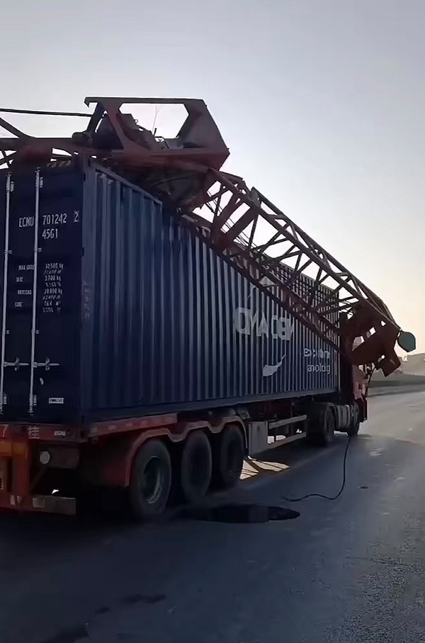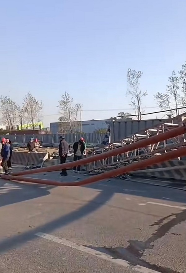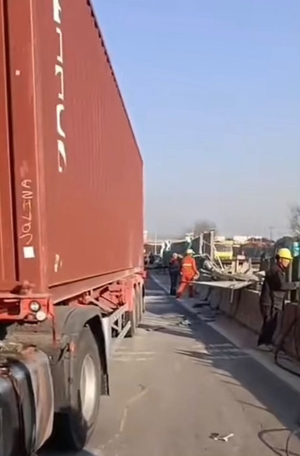 据现场网友介绍,事发时,高速公路施工区域内的一台搅拌桩机突然倒伏,桩机的金属部件砸到途经一辆集卡的箱体上。事故发生后,集卡驾驶员立即停车,下车查看情况并报警。