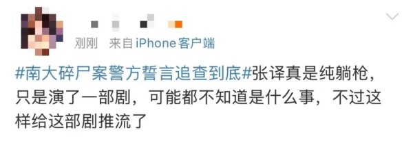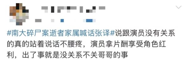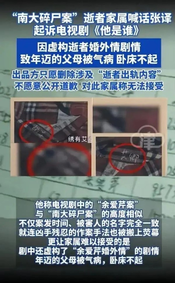 因为剧中“余爱芹案”与“南大碎尸案”高度相似,受害者家属喊话演员张译,称其主演电视剧《他是谁》给被害人家属带来极大伤害,并控诉电视剧《他是谁》侵权。