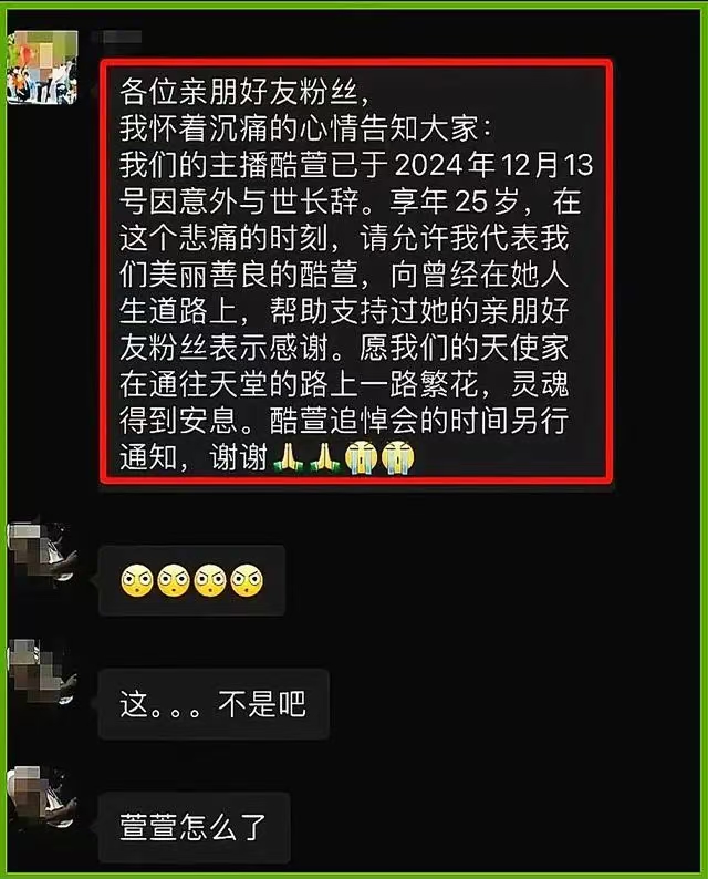 在这则消息中表示:女主播酷萱于2024年12月13日已经去世了,还表示会另找时间通知大家追悼会的时间。