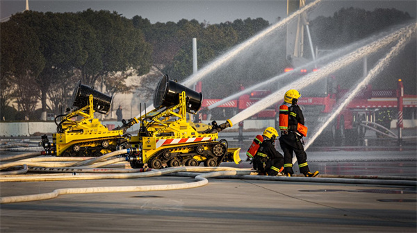 值得一提的是,在此次演练中,现场调度了多台灭火机器人参与救援。这些机器人在高温高热、易燃易爆等高危环境中发挥了巨大作用,它们能够深入到消防员难以直接进入的区域进行灭火作业,从而大大降低了消防员的安全风险。同时,灭火机器人与无人机、大跨距消防车等先进设备的紧密协作,使得战术部署更为灵活和科学,充分体现了现代化消防工作的先进理念和高效模式。