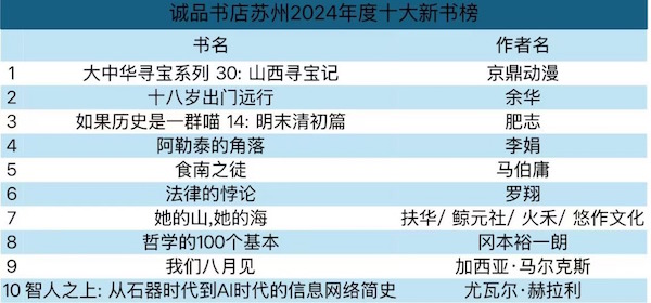 阅读观照日常,探索内在自我。基于年度经营数据,诚品书店苏州“年度十大新书榜”今天发布,《大中华寻宝系列 30:山西寻宝记》《十八岁出门远行》《如果历史是一群喵 14:明末清初篇》……一份榜单,诠释当代读者对于个人精神生活与时代脉搏的感悟。