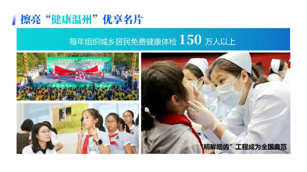 健康温州。立足全人群,坚持医防融合,近三年来每年组织城乡居民免费健康体检150万人以上,将结直肠癌等恶性肿瘤筛查以及脑卒中、糖尿病防治等纳入民生实事,成功创建国家慢病综合防控示范区3个,“明眸皓齿”工程成为全国典范。