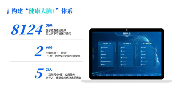 构建“健康大脑+”体系,目前市域全覆盖全贯通,并且应用场景不断迭代升级,医学检查检验结果互认共享累计节省医疗费用8124万元,生命急救一键达让“120”急救反应时间平均缩短2分钟,“互联网+护理”服务超过5万人。