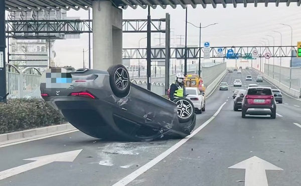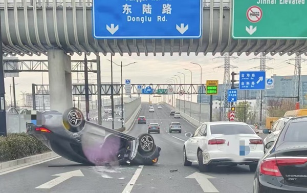 据目击者说,这起车祸发生在杨高中路往杨高北路东陆路方向的高架路段前。当时,两辆轿车发生碰撞后,其中有一车翻车。途经现场的市民,这辆银灰色的轿车四轮朝天,翻在一号车道上;另一白色轿车停在二号车道上,车辆左后侧有撞击痕迹。