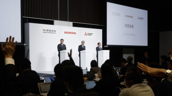 日产社长内田诚(左起)、本田社长三部敏宏和三菱汽车社长加藤隆雄23日在东京召开联合记者会。图源:GJ