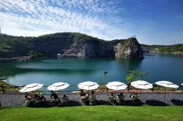 醇香的咖啡、深幽湛蓝的湖水加上冷冽峻峭的岩石,网红打卡地深蓝计划太好拍了。深蓝计划位于梅溪镇红庙村,利用废弃矿坑和老厂房改造而来。临水岸边摆放着成排的遮阳伞和露营椅,场内一幢水泥建筑打通大窗,成了极好的景观台。有人聚会,有人放空,更多的人是在出片点拍照。
