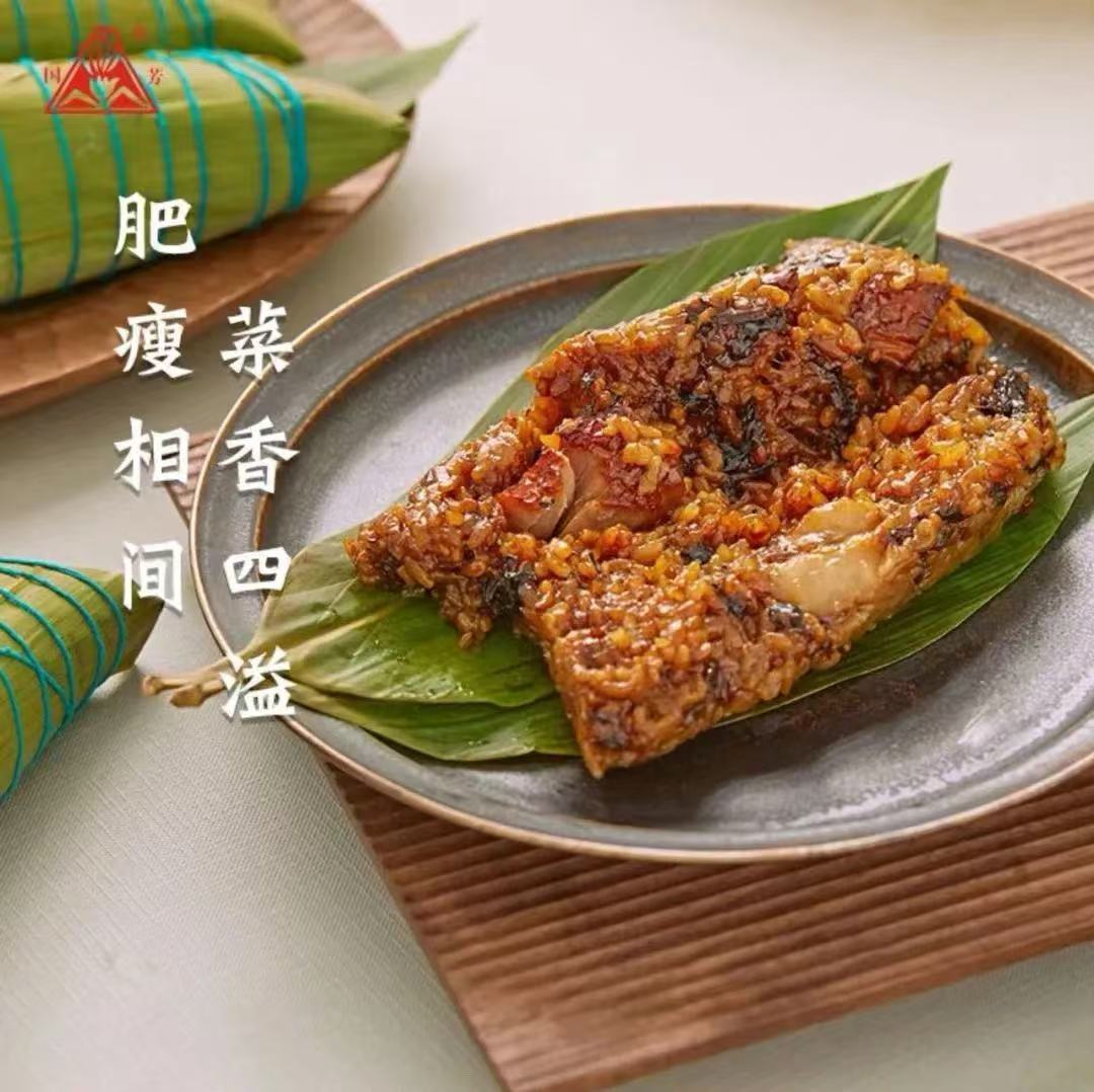 湖州人常买的另一个粽子品牌——国芳粽子,也是本地的老字号。梅干菜肉粽是它的一大招牌,糯米软糯,肉汁鲜美,一口下去,梅干菜的香气扑鼻而来。青豆玉米香肠粽、蛋黄肉粽、排骨粽……国芳粽子还做了很多创新。