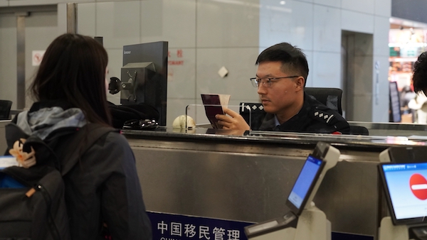 图说:上海机场移民管理警察查验出入境旅客。石明明 摄