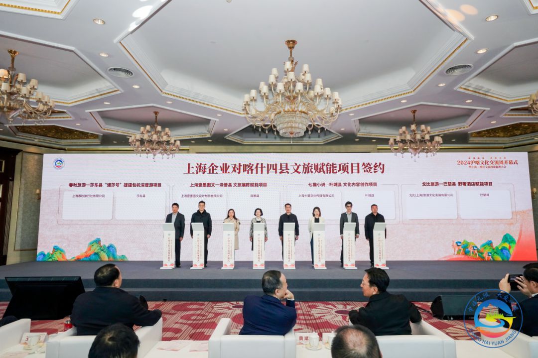 在2024沪喀文化交流周开幕式暨上海-喀什文旅投资促进大会现场,上海对口援疆莎车县、泽普县、叶城县、巴楚县四县文旅代表来到现场推介,“千年丝路锦绣传承”非遗文创开发、“喀什丝棉经线数字化印花和无水工艺”研究、“浦莎号”援疆包机游深度开发及宣介等9个项目在现场签约,从共同保护喀什非遗传承,到助力喀什传统棉纺织产业数字化,从共谋喀什文旅资源深度开发到文艺作品共创、文旅展陈共赋能、电商联盟共发展,产业援疆和文化润疆的载体在沪喀两地正在不断丰富。