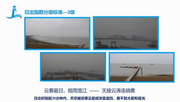 日出指数是根据天气状况(降水)、云量、能见度等关键气象因子,将日出观赏条件划分为三个等级:
