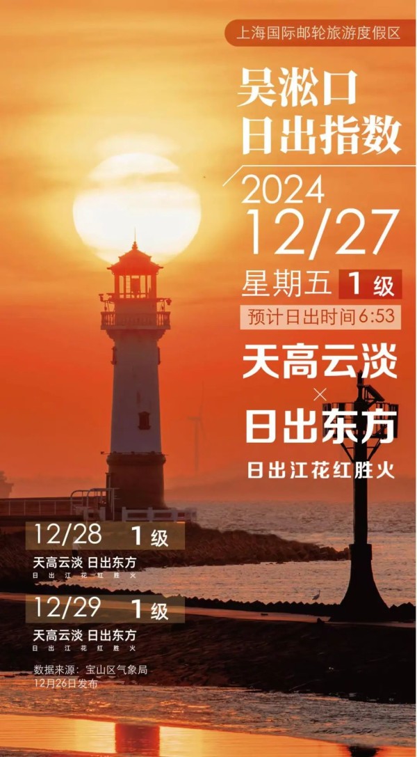 12月26日,“吴淞口日出指数”在宝山首发。预报显示,未来三天,气象条件优,适宜观日出美景。