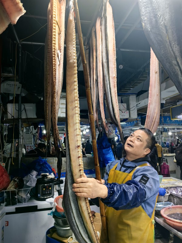 来源:新民晚报申城年味越来越浓,陆家浜路中福菜市场,充满了上海的传统年味。一条条香气四溢的鳗鲞、青鱼、黄鱼悬挂在半空,腊肠、咸肉等年货也玲琅满目。市民纷纷来此购买海鲜、笋干年货,提前备置春节美食。代客加工鳗鲞的摊主们忙得不亦乐乎。