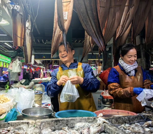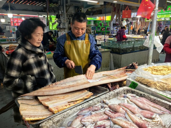 申城年味越来越浓,陆家浜路中福菜市场,充满了上海的传统年味。一条条香气四溢的鳗鲞、青鱼、黄鱼悬挂在半空,腊肠、咸肉等年货也玲琅满目。市民纷纷来此购买海鲜、笋干年货,提前备置春节美食。代客加工鳗鲞的摊主们忙得不亦乐乎。