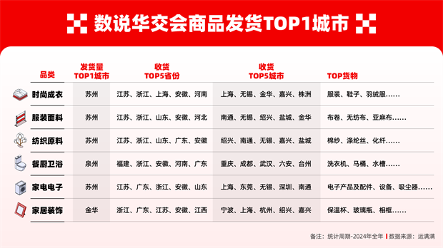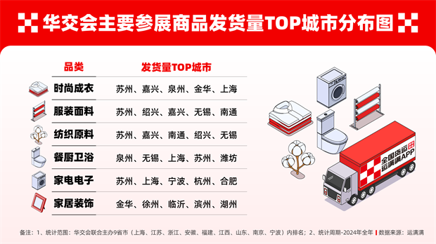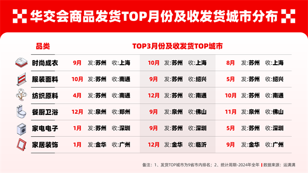 数据显示,2024年,此次参展的时尚成衣、服装面料、纺织原料、餐厨卫浴、家电电子、家居装饰等主要品类中,九省市的发货量均排在全国前列,显示出九省市制造业的旺盛、区域经济的协同、消费的发达以及交通的通达。其中,苏州表现尤为亮眼,在时尚成衣、服装面料、纺织原料、家电电子等几个品类中,均在全国或九省市区位内位列第一,既装扮了消费者的日常穿着,又提供了家电电子等生活娱乐设施。