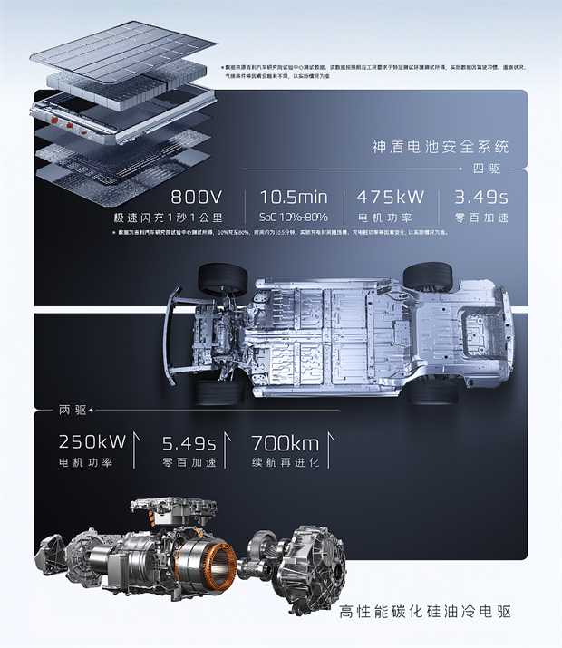 基于SEA全球智能纯电架构打造的全新吉利银河E8,在三电领域实现“油冷电机+神盾电池+5.5C极速闪充”三位一体升级。全系换装全新一代X-pin扁线绕组工艺油冷电机,功率密度提升至3.1kW/kg,零百加速3.49秒;400V两驱版CLTC续航提升至700km,平均能耗低至12.4kW/h。800V四驱版全面提升的5.5C超快闪充,1秒1公里,SoC 10%-80%仅需10.5分钟。