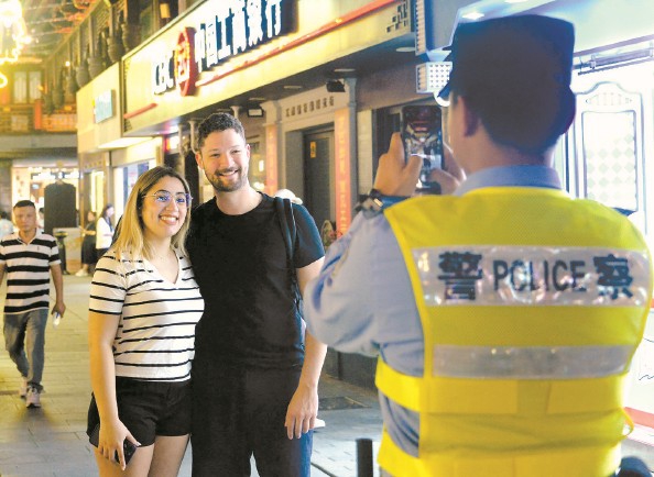 今年国庆中秋节日假期叠加,旅游流、消费流相互交织。为确保黄浦区外滩、南京路步行街、豫园等重点区域的治安、交通有序可控,黄浦公安在假期里全员上岗,在落实各项安保工作的同时,还热情为中外游客提供服务。 图为在豫园执勤的一位民警不仅用英语为外籍游客答疑解惑,还为他们记录下美好瞬间 杨建正 摄影报道