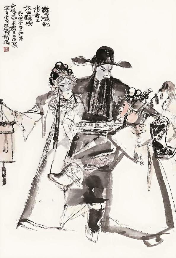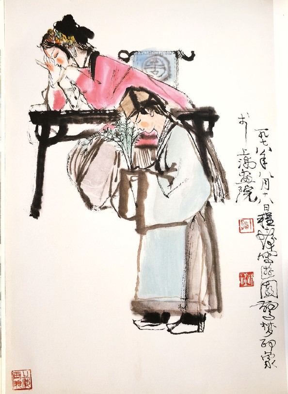 国画与昆曲的这种“蝶恋花”情结,“双向同构”效应,发老维系了终生。他曾对我讲过:“昆曲与国画实际上是同根同源,同祖宗的。”昆曲的叙事方式是写意性的,人物的表演形态是抽象性的,戏剧的内核是诗化性的,舞台的表演是书卷性的,这也正是发老昆曲戏剧人物画的笔墨追求与艺术呈现。如他画的昆曲《游园惊梦》印象,整个画面就极有梦幻朦胧感,构图是颇像特写镜头般的呈现,太守之女杜丽娘在偷偷游览后花园时,由吟唱“原来姹紫嫣红开遍,似这般都付与断井颓垣”而引发了伤春惜春之情。发老抓住了这一心理特征,刻画了杜丽娘回闺房后,伏案托腮入梦见手持柳枝的书生柳梦梅。尽管二人都是在低首闭眼,处于亦梦亦幻、似空似无的状态,但这种“此时无声胜有声”的场景,传导了对封建礼教的抗争与婚姻自由的向往,从而使曲画合一、戏画相融,让昆曲之魂与丹青之美相得益彰。