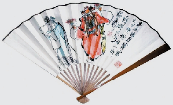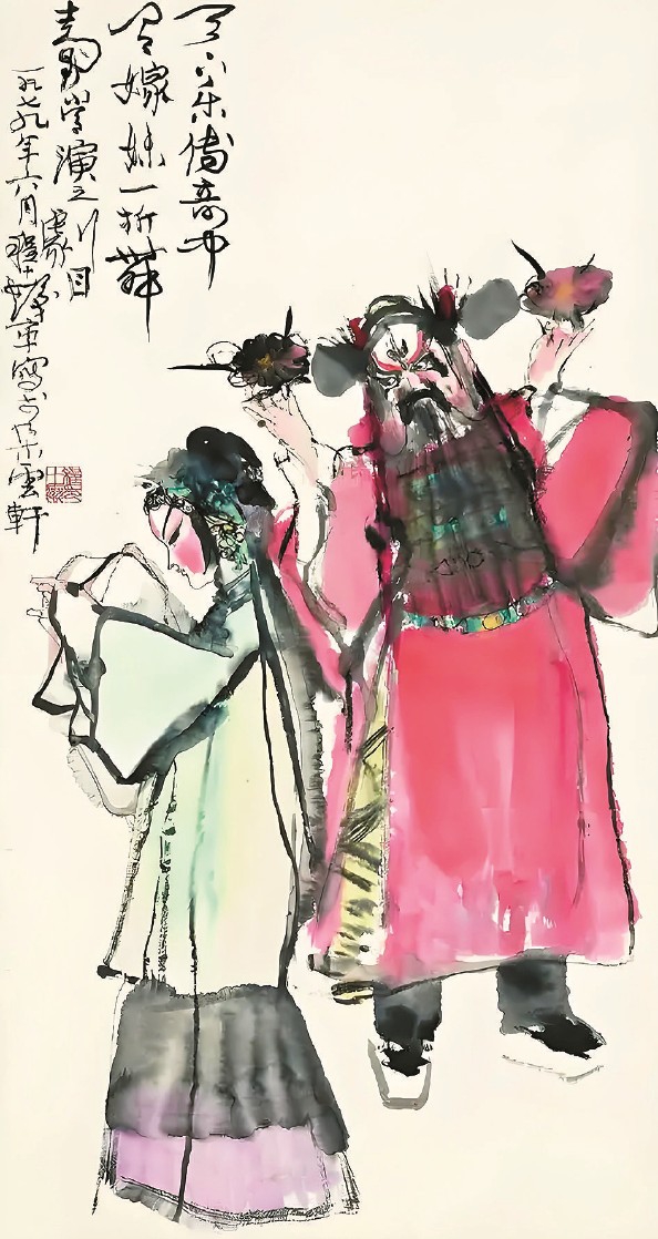 昆曲为发老的绘画提供了丰富多元的创作题材与异曲同工的美学理念。发老曾深有感悟地讲:“昆曲唱腔讲究‘收音藏尾,字正腔圆’,书画线条也重视‘藏头护尾,锋正笔圆’。”发老画过很多昆曲戏剧人物,但他最爱画、画得最多的是钟馗。1959年,他在北京看了北昆名角侯玉山的《钟馗嫁妹》,侯老功底扎实,在舞台演得行云流水中见稳健自然,刚柔相济中显风趣多姿,繁简得当而以一当十,令程十发感到震撼而惊艳,也使他悟到昆曲的唱念做打与国画的笔墨线条有许多相似相通之处。于是,他精心创作了《钟馗嫁妹》。自此一发不可收,还创作了扇面、立轴、册页、中堂等,其中最精彩的是他唱曲所用折扇的扇面画《天下乐嫁妹》,整体构图严谨而简洁生动,章法疏密有致而呼应顾盼,笔墨酣畅而明快流练,线条潇洒而灵动奇谲,色彩饱满而俏丽秀艳。特别是钟馗欢乐地手捧鲜花欲献妹,而其妹则是侧身以袖掩面,显得相当羞涩。这很好地再现了舞台场景,使曲入笔中,墨含戏韵,再现了钟馗的侠骨柔情。在中国戏剧人物画史上,从明周臣、顾正谊、陈洪绶到清沈蓉园、罗聘、任伯年等,如发老这样以鲜明独特的“程家样戏剧人物画”而开创个人图式风格的,是具有美术史意义与戏剧学价值的。