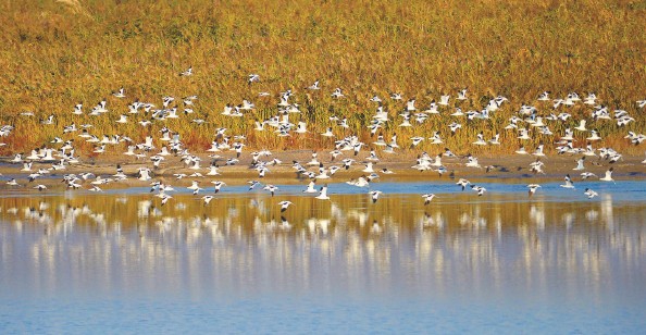 大批迁徙中的反嘴鹬成群结队抵达崇明东滩湿地