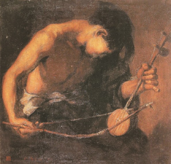 现实主义始终是20世纪上半叶广东油画创作的主脉。广东籍油画家拥抱时代,介入社会,反映现实,使写实油画成为传达人文精神和表现思想的重要载体。曾留学英国和美国的李铁夫是中国最早出国学习油画艺术的广东籍留学生,也是中国最早出色地熟练掌握西方纯正写实油画技术的油画家。从这次在上海亮相的《盘中鱼》《未完成老人像》《画家冯钢百像》《刘素薇肖像》等李铁夫创作于不同时期的油画中,可以一窥他所具有的准确严谨的造型能力和高度概括力,其作品色彩含蓄,体现出写实油画典雅、细腻、传神的艺术特征。李铁夫一生追随孙中山,因此,艺术与革命自然也就成为他生活的主旋律。他努力钻研西方油画艺术,又将卖画所得捐作革命经费。曾留学加拿大的广东油画家余本的名作《奏出人间辛酸》这次也出现在中华艺术宫。余本擅长表现行乞者、餐厅洗碗工、车夫、街头艺人、苦力等社会底层人物。《奏出人间辛酸》以简洁、准确、有力的笔触和古典油画的“酱油色”,塑造了一位在艰辛的劳作之余以二胡抒发悲苦心声的海外华工的形象:三角形的构图,画面人物裸露的充满有力的肌肉的胳膊和紧绷的琴弓之间形成富有张力的对比,营造出特有的悲伤气氛。广东籍画家司徒乔因为当年与鲁迅的关系而广为人知,这位曾赴法国游学的广东油画家,这次又以他1940年创作的代表作《放下你的鞭子》而引起上海观众的关注。其时,司徒乔在新加坡观看了演员金山与王莹演出的《放下你的鞭子》,深受感动,当场画下速写,之后又将演员请到画室做模特,创作了这幅油画名作。作品体现了画家对祖国的怀念和对日本侵略者的愤怒。画面人物的刻画入木三分,其深度、视觉和构图造型别开生面,仿佛是在饱满的情绪中一气呵成。
