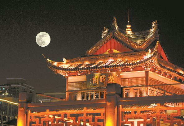 夜幕中的“超级月亮”与豫园明清古建筑“凝晖阁”相映成趣,别有一番意境(二次曝光) 杨建正 摄